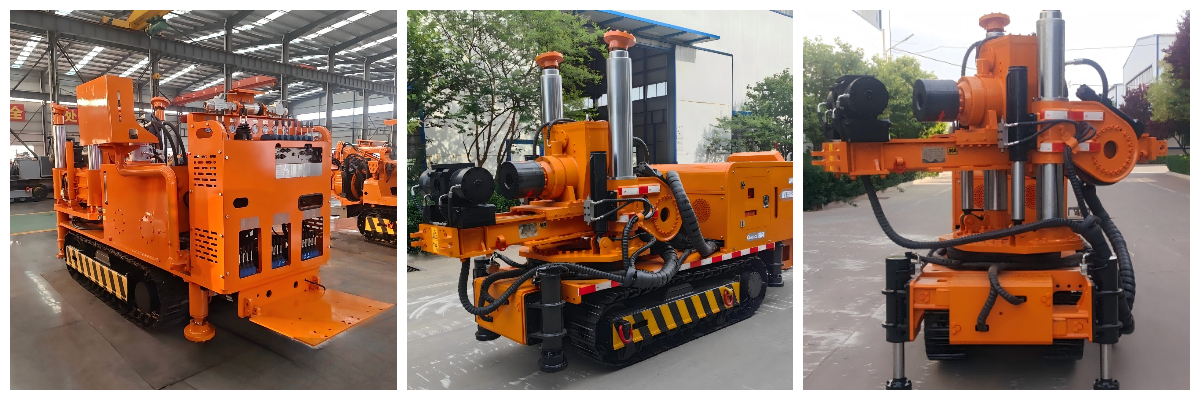 Cette foreuse adopte une configuration modulaire et se divise en trois parties principales : l’unité principale, la centrale hydraulique et la console de commande, reliées entre elles par des tuyaux en caoutchouc.